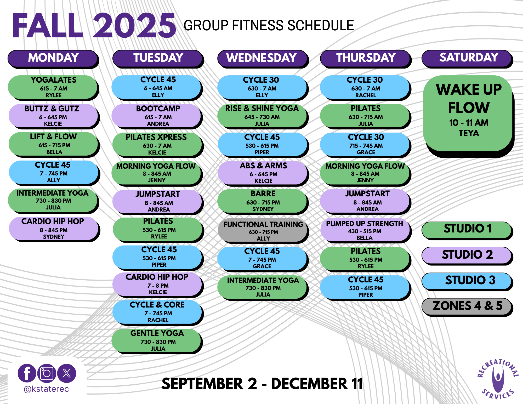 Group fitness is a fun and social way to exercise led by nationally certified instructors.All group fitness classes are free of charge to K-State students and facility card members.
